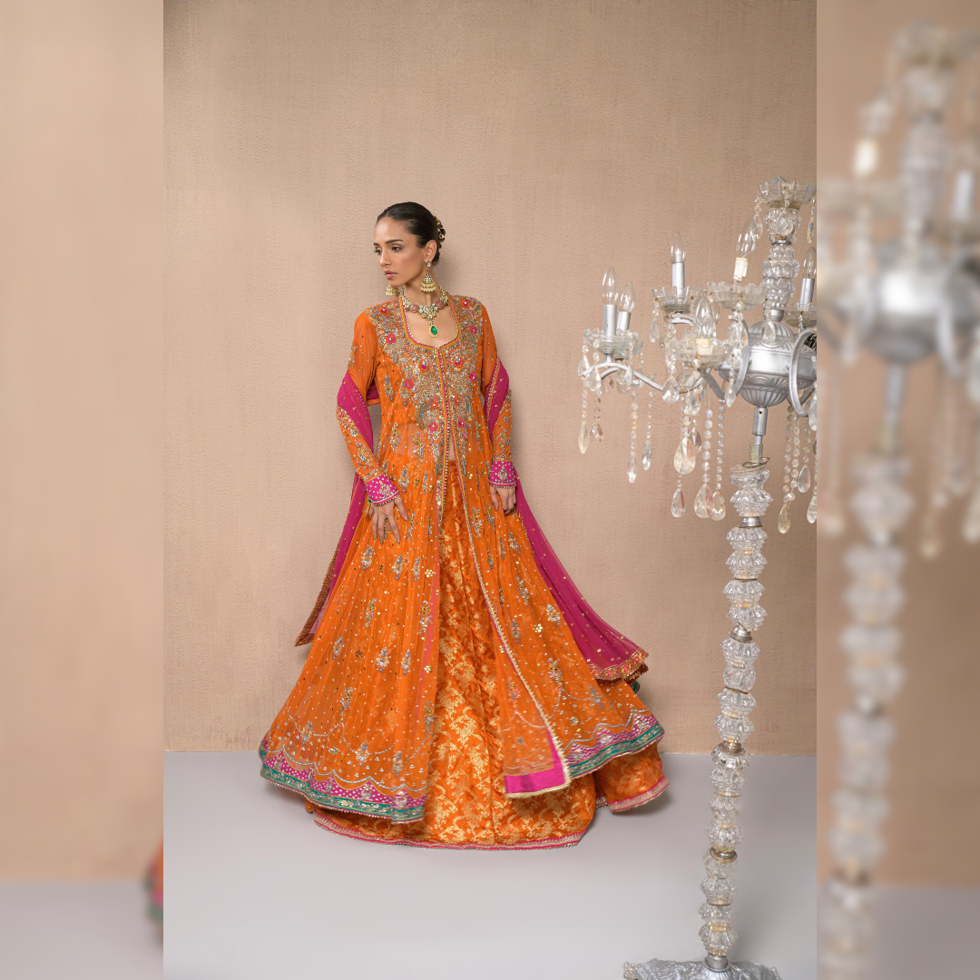 Bask in the brilliance of Adah, a mesmerizing lehenga set bathed in the glow of saffron orange and kissed by the decadence of fuchsia and emerald. The sheer peshwas top cascades into a voluminous flare, embroidered with celestial motifs and glimmering gota detailing. Each bloom and swirl is carefully rendered in resham, tilla, and sequinsālayered like poetry on the skin.