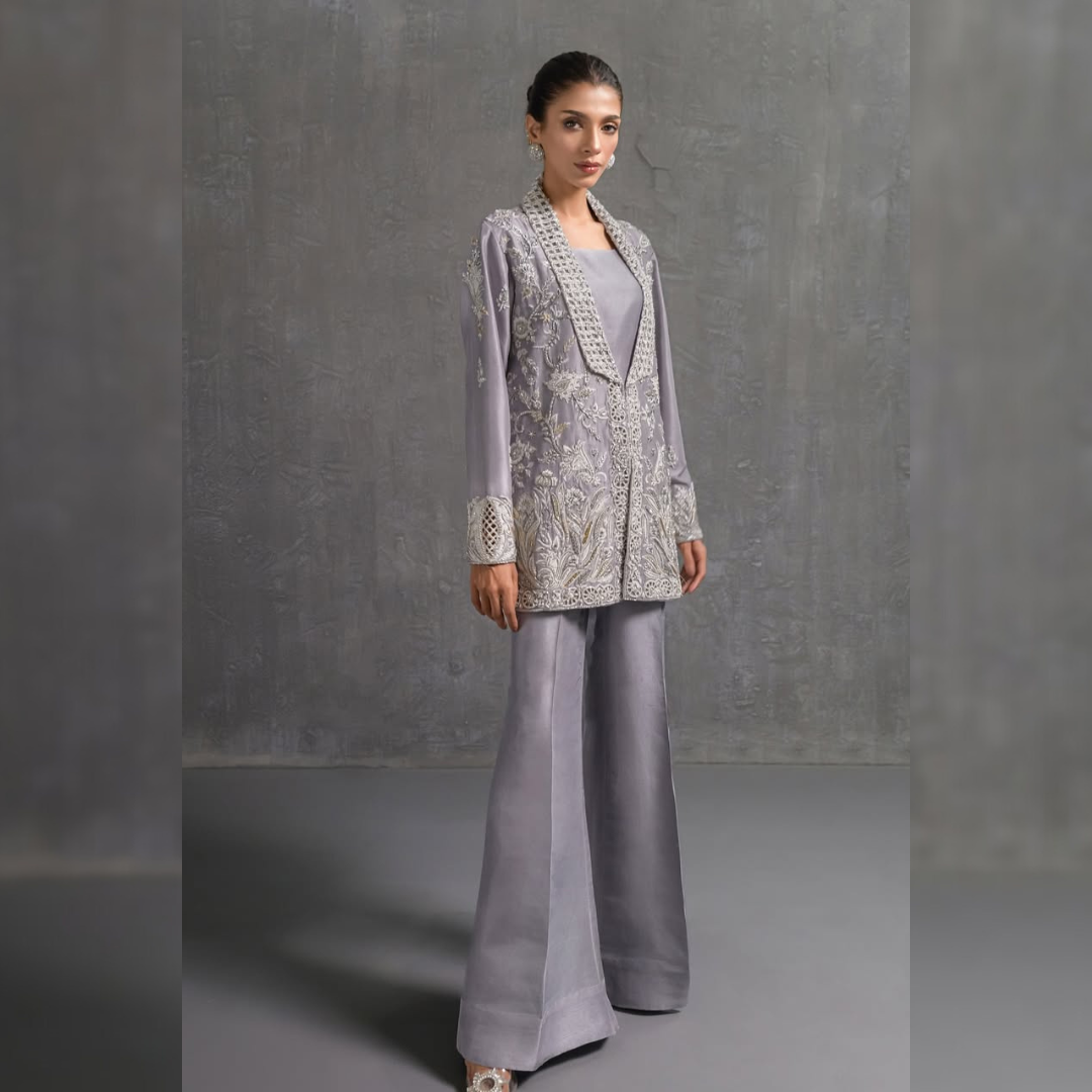 This sumptuous short jacket represents the epitome of haute couture, meticulously crafted from premium raw silk and featuring exquisite cutwork lapel collar, intricate floral embroidery and elegant appliques border. The outfit is paired with a trendy boot cut trouser.