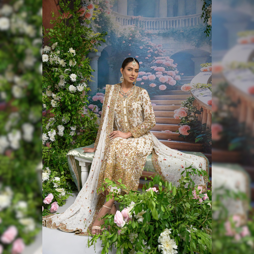Paired with an intricately embellished net dupatta, scattered with pearls and floral appliqué, and bordered with luxurious handwork, this look balances opulence with softness. The izaar peeks subtly underneath, flaring out in waves of ivory and gold , making it ideal for ceremonial entrances and evening light.