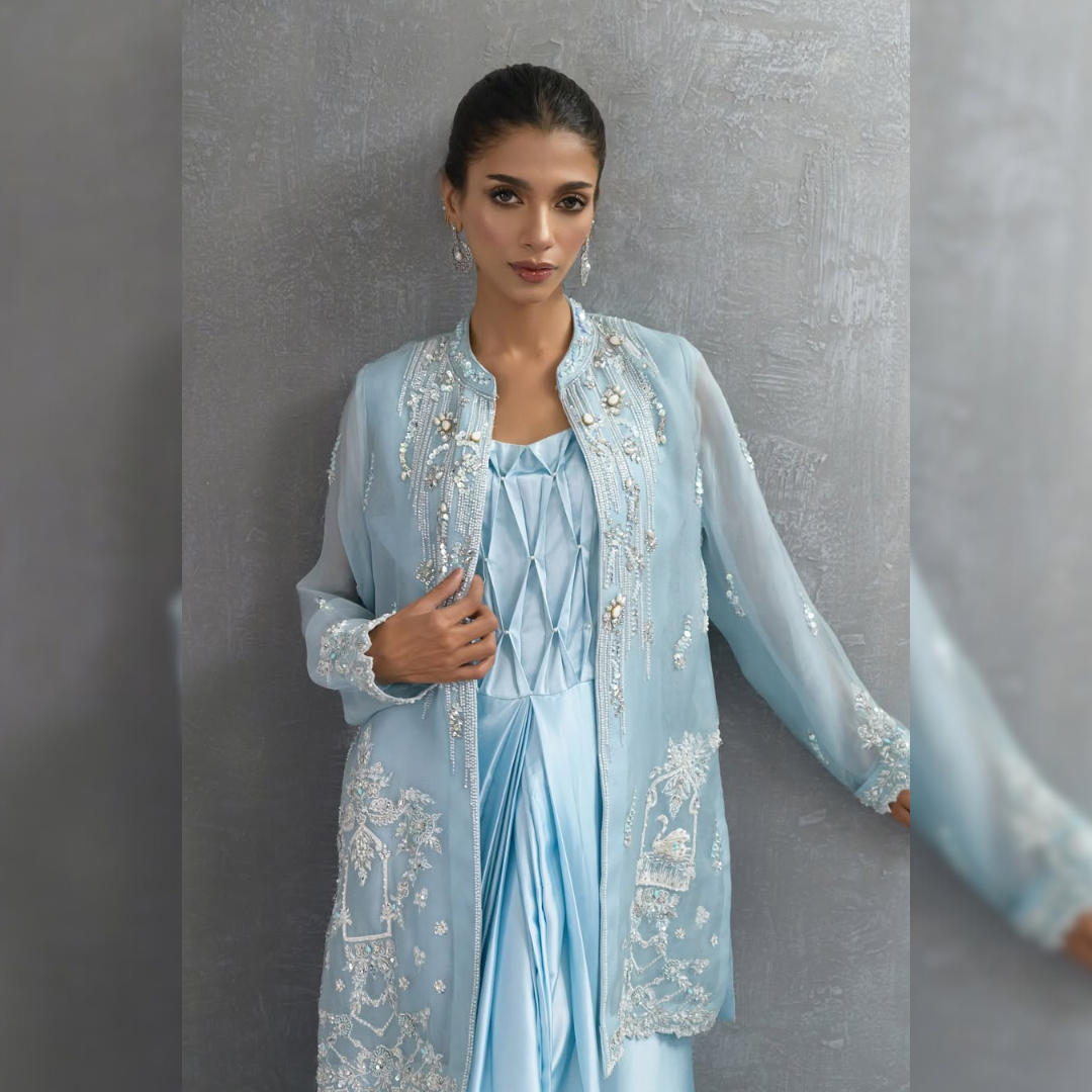 Step into sophistication with our exquisite ice blue short organza jacket, featuring intricate hand embroidery that showcases stunning craftsmanship. The delicate sequins and shimmering beads add a touch of glamour, while the elegant pearl work enhances its luxurious appeal. This jacket is beautifully designed to complement the long gown underneath, creating a perfect ensemble for any special occasion. Make a statement with this unique piece that combines modern elegance with timeless charm!