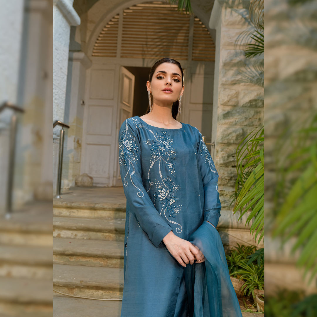 This celestial charcoal grey ensemble crafted on pure rawsilk, features an asymmetric cut and a harmonious blend of applique embroidery and intricate hand embroidery. The outfit is paired with a pure organza dupatta and straight trouser
