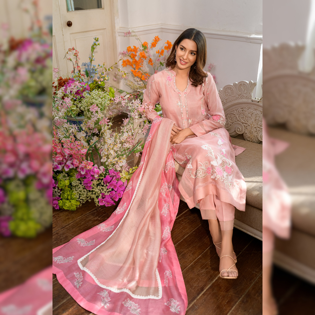 Crafted on the soft colors of Blossom pink, this outfit features intricate cutwork and appliques. Adorned with hand embroidered motifs and dainty laces. The outfits is paired with 2 toned organza dupatta with block print and straight trosuer