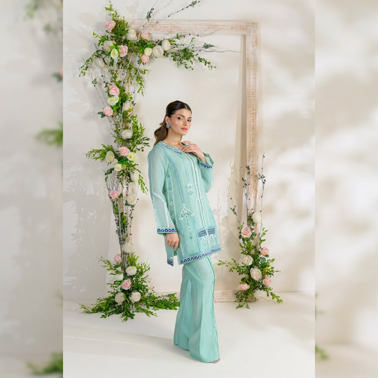Crafted from the pure, airy elegance of organza, this breezy tunic is a vision of delicate sophistication. It features intricate aari embroidery adorned with contrasting appliqués and dainty floral details, creating a harmonious blend of texture and design. Paired with matching cotton silk bootcut pants, the ensemble offers a graceful yet contemporary silhouette—perfect for effortlessly chic occasions.