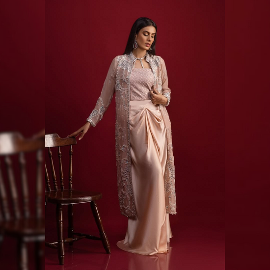 Our exquisite light pink organza jacket is a masterpiece of craftsmanship, featuring delicate pearls intricately embroidered throughout, cutwork embroidery, tambour beading, and contrasting aqua blue stones. This enchanting ensemble includes an embroidered net blouse and satin silk sarong, creating an unforgettable look for formal events and special occasions. The intricate details and luxurious fabrics ensure a regal presence.