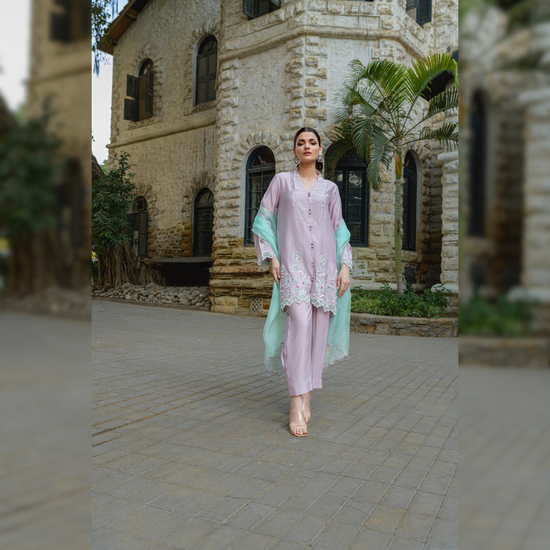 Crafted on soft fabric of khaddi silk, this outfit features intricate organza floral details and embellishments. Paired with an organza dupatta and box pleated pants