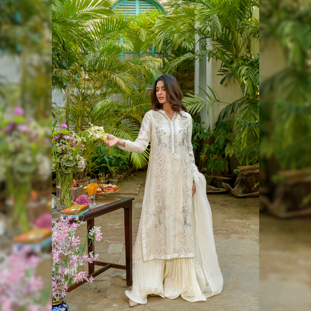 A pure organza shirt adorned with appliqué and cutwork. Featuring a hand embellished neckline of crystals and pearls and stunning embroidered motifs, the outfit is paired with an embroidered organza dupatta and crushed culottes.