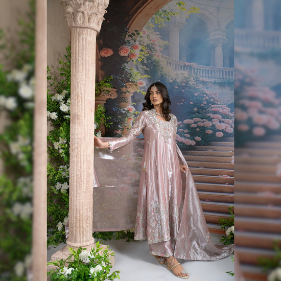 Bathed in the ethereal glow of moonlight,Miral is a symphony of elegance crafted in a delicate mauve-pink velvet. The ensemble blooms with hand-embroidered florals in hues of silver, blush, and soft gold — a garden of whispers stitched with devotion. Crystal beads and dainty tassels dangle like morning dew, while the regal silhouette flows with the grace of a forgotten Mughal princess wandering through a rose-draped palace. Finished with a flowing dupatta that glistens like stardust, Miral is made for evenings that feel like poetry.