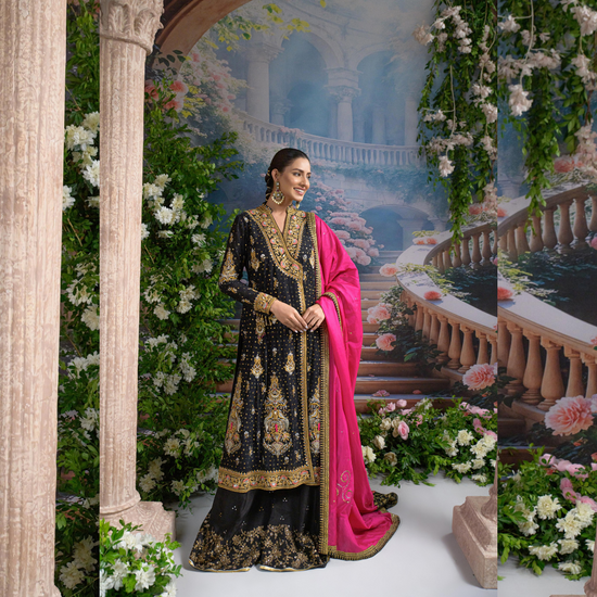 Dark as the velvet sky and radiant as a star at its zenith, Nooreh is a celebration of contrast and craft. The outfit features a flowing angarkha-style silhouette, meticulously embellished with gota and marori work, where shimmering threads trace tales of heritage with golden precision. Against a jet black canvas, resplendent motifs unfold in antique gold and soft pink ā delicate florals, regal medallions, and scattered kaamdani dots that glimmer like stardust.