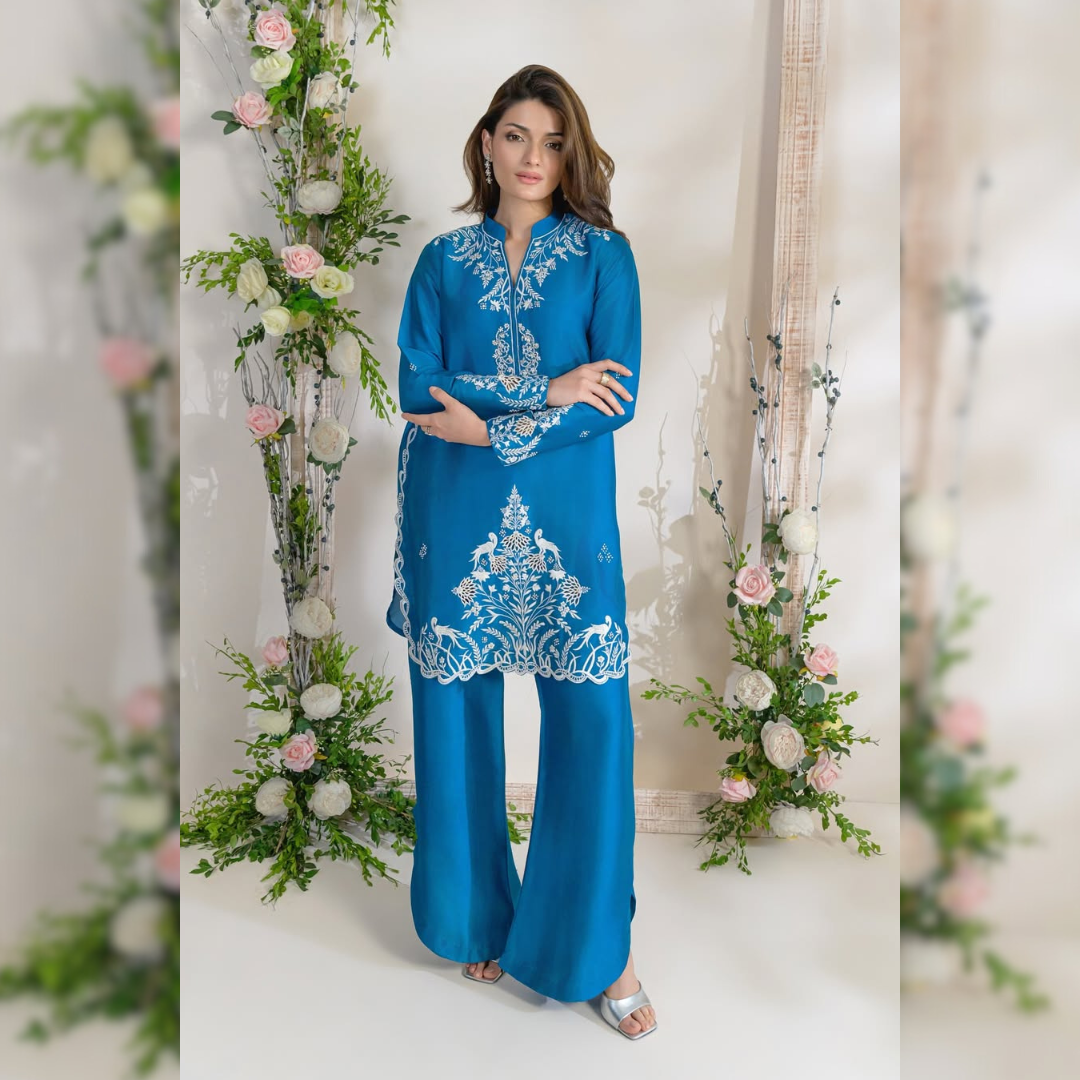A vision of regal elegance, this ensemble is crafted from luxurious pure Maysuri silk, exuding a soft, luminous sheen. The fabric is adorned with intricate machine embroidery, thoughtfully inspired by timeless Mughal artistry, and elevated with delicately hand-embroidered motifs that add depth and charm. The look is completed with slim, gracefully curved culottes and a sheer organza dupatta, finished with dainty sequin detailing along the hemlineāperfectly balancing heritage with refined modernity.