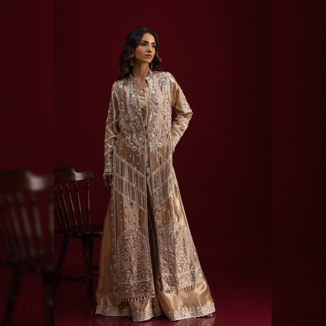 Elevate your style with our majestic golden lame ensemble, showcasing intricate Aari embroidery, delicate pearls, and Zardoz details. Crafted from soft lame fabric, this stunning outfit is paired with a lightweight organza dupatta and embroidered lame culottes, perfect for making a regal statement