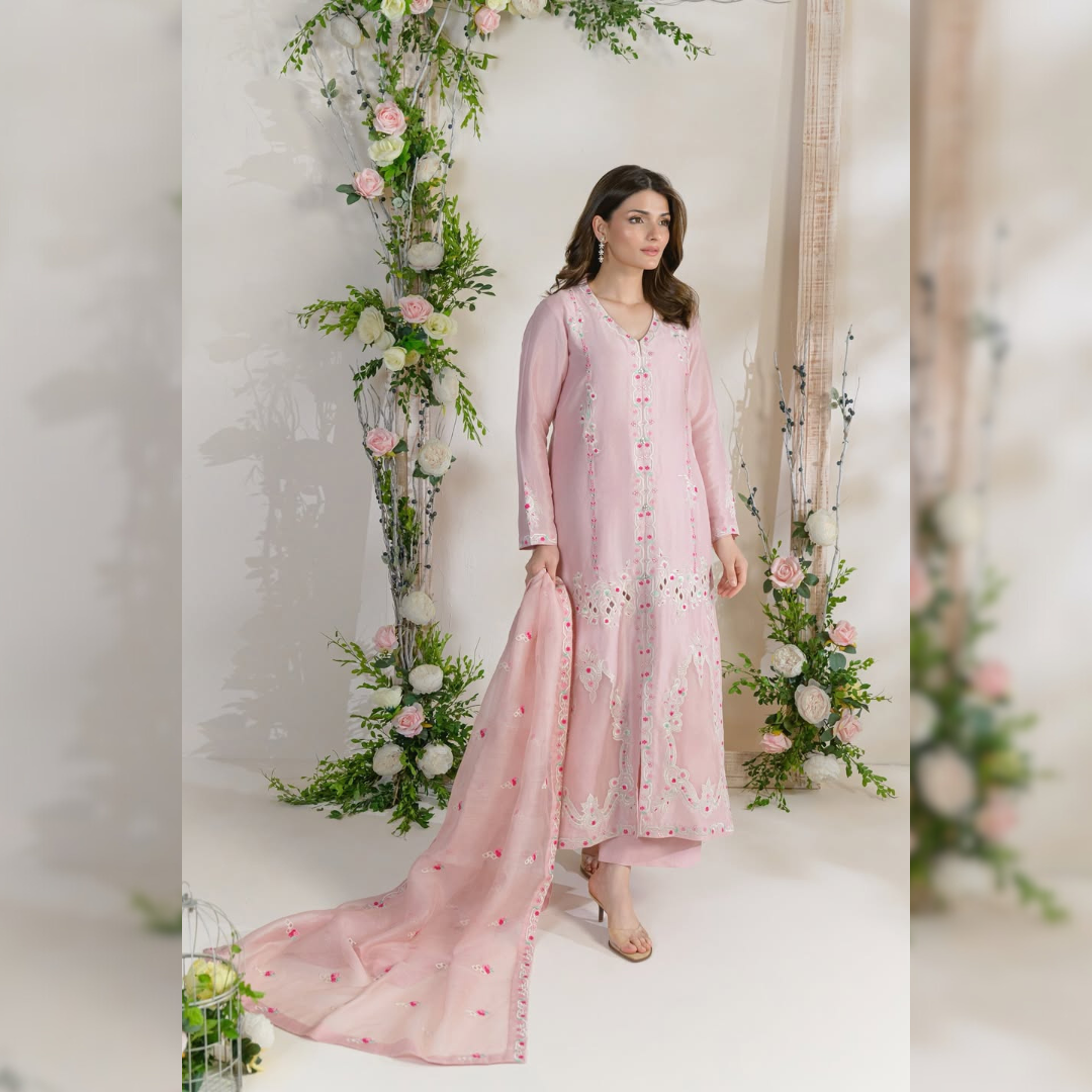 Crafted from the rich elegance of pure raw silk, this ensemble is a timeless must-have. Rendered in a soft, light pink hue, it features intricate machine embroidery with delicate floral motifs and graceful organza appliqués, creating a look of understated sophistication. Paired with an exquisitely embroidered silk Karandi dupatta and a matching cottonsilk izaar, this outfit exudes refined charm and feminine grace.