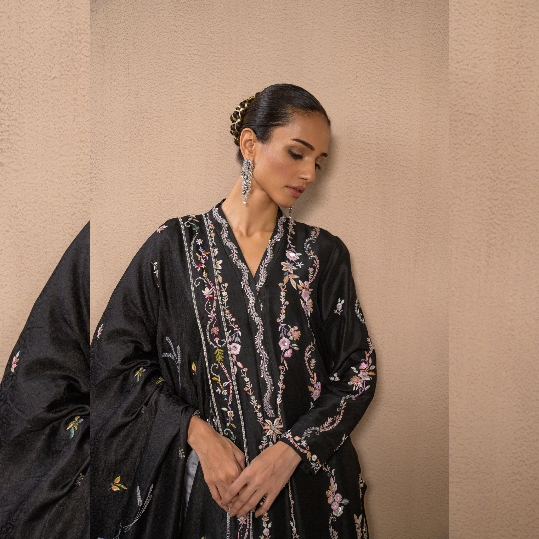 Draped in midnight black, this ensemble whispers tales of timeless grace. Cut from luxurious silk and adorned with pastel florals, delicate birds, and leafy palms, the design pays homage to nature’s quiet grandeur. The kalidar silhouette flows with subtle volume, accented by a wide, sweeping shawl that mirrors the garment’s hand-embroidered storytelling. Paired with tapered trousers for a balanced structure, it’s a look that celebrates quiet confidence and intricate craftsmanship.