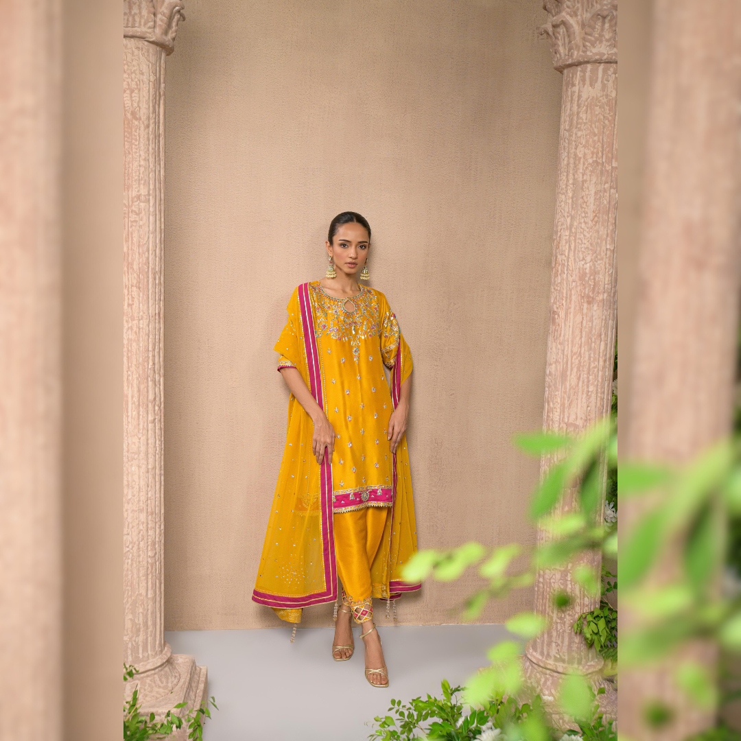 A radiant celebration of colour and craft. This mustard hued short kurta is adorned with vibrant resham embroidery, delicate gota work, and mirror accents, creating a festive interplay of textures. Paired with a tailored shalwar featuring gota detailing at the cuffs, the look is completed with a chunari-inspired dupatta featuring kaamdani and traditional finishing. Perfect for mehndi and mayun festivities, this ensemble is rooted in heritage yet refreshingly vibrant.