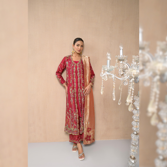 A regal ode to opulence, Soraya is a masterpiece in deep crimson red, adorned with intricate embroidery that glistens like constellations in velvet dusk. The front-open design flows gracefully over a rich underlayer, while the embellishments dance with threads of gold, sage, and blush — echoing floral vines from miniature paintings. The neckline, adorned with fine tilla work, frames the face with quiet grandeur, while the sleeves whisper romance with every glinting motif.