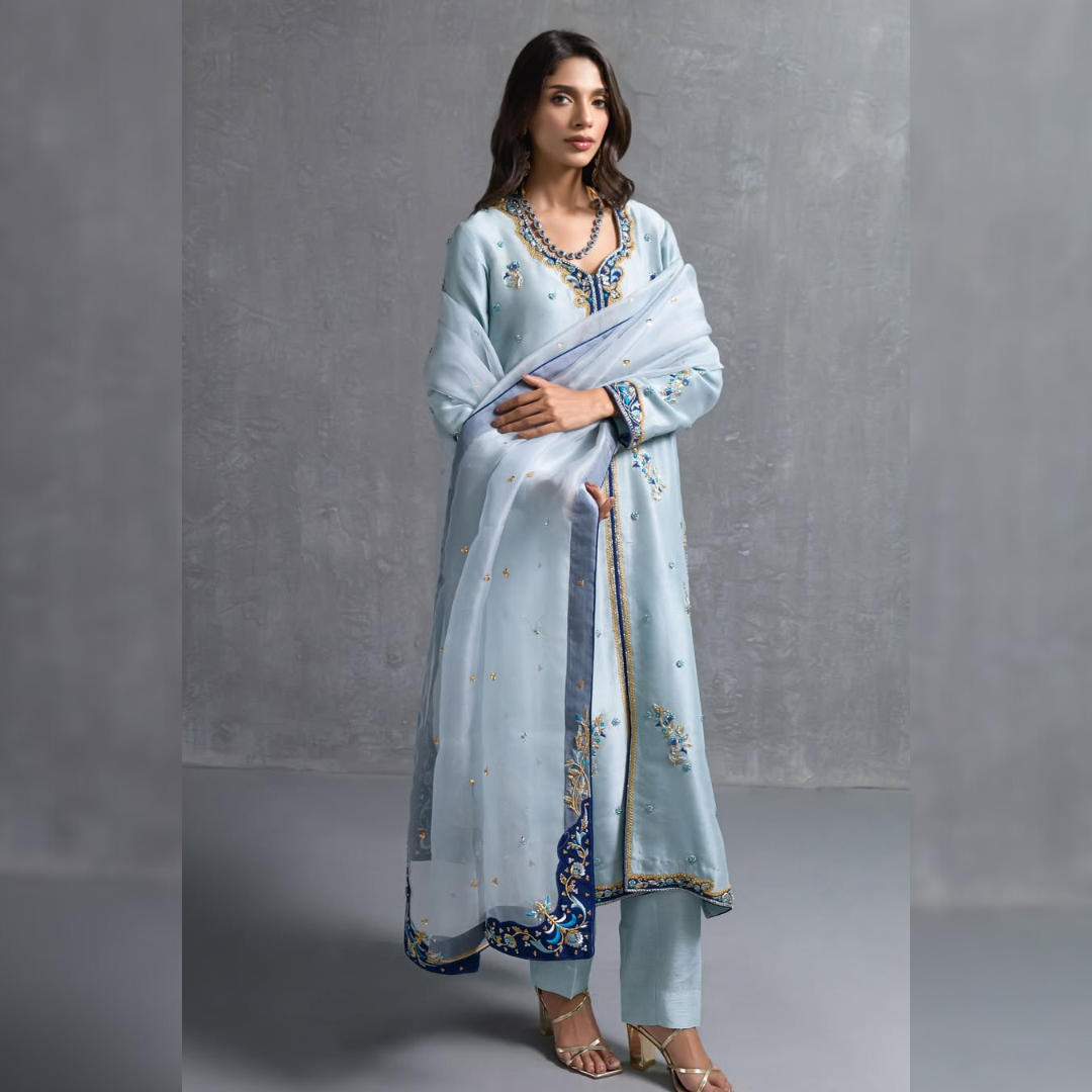 Unveil your elegance with this enchanting ice blue long shirt, adorned with exquisite contrasting appliqué, marori and zardoz. Beautifully enhance by elegant floral motifs crafted with resham and sequence Paired with a delicate organza dupatta featuring beautiful appliqué detailing at the corners, this outfit is a perfect blend of sophistication and charm, ideal for any special occasion.