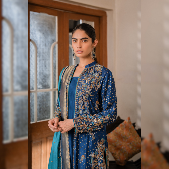 Zimal Jacket is an exquisite front-open jacket made from pure raw silk, embellished with intricate kaamdani, zardoz, and delicate cutwork detailing. This ensemble is elegantly matched with a kattaan silk dupatta featuring kaamdani and zari trims, as well as an izaar adorned with cutwork embroidery.